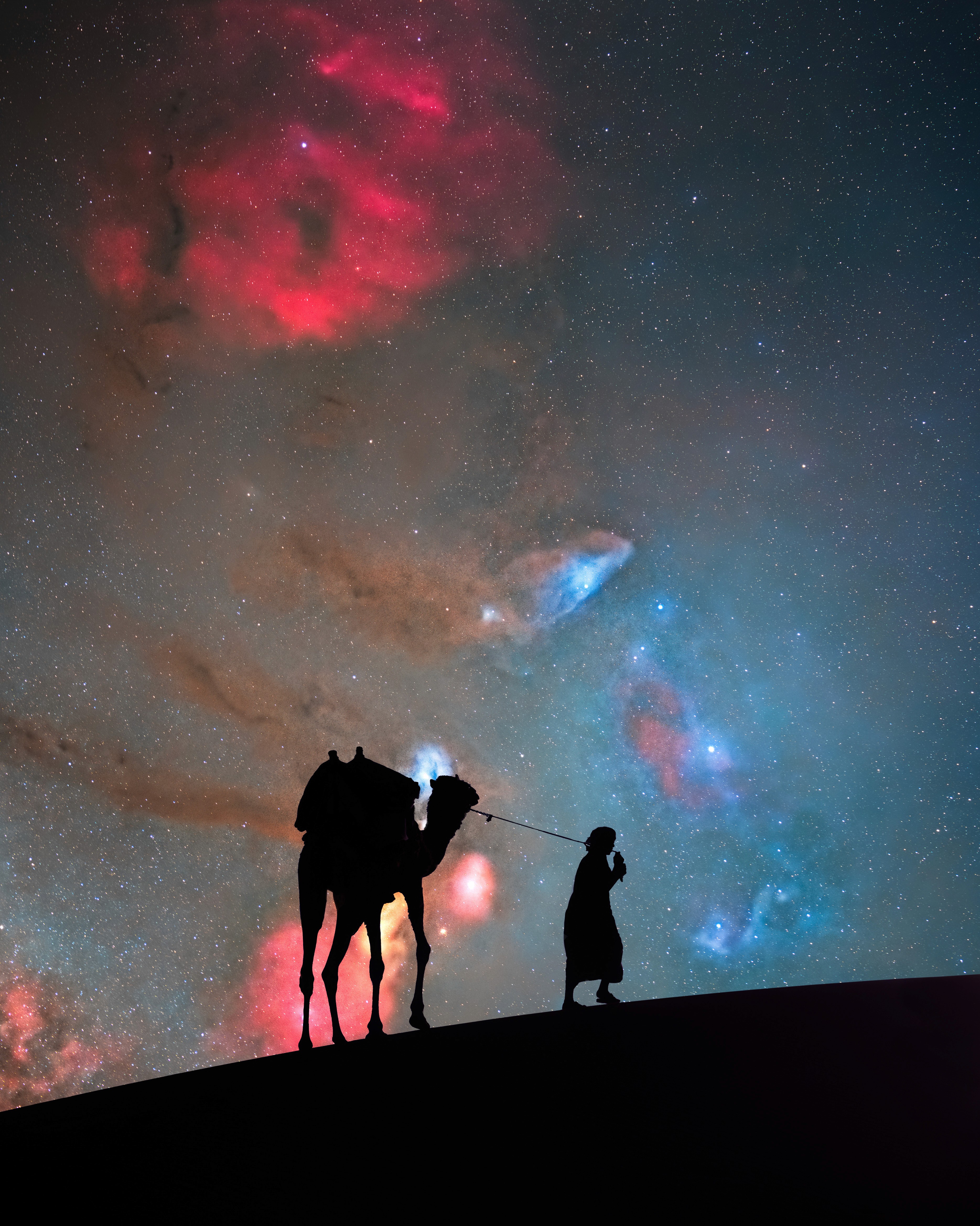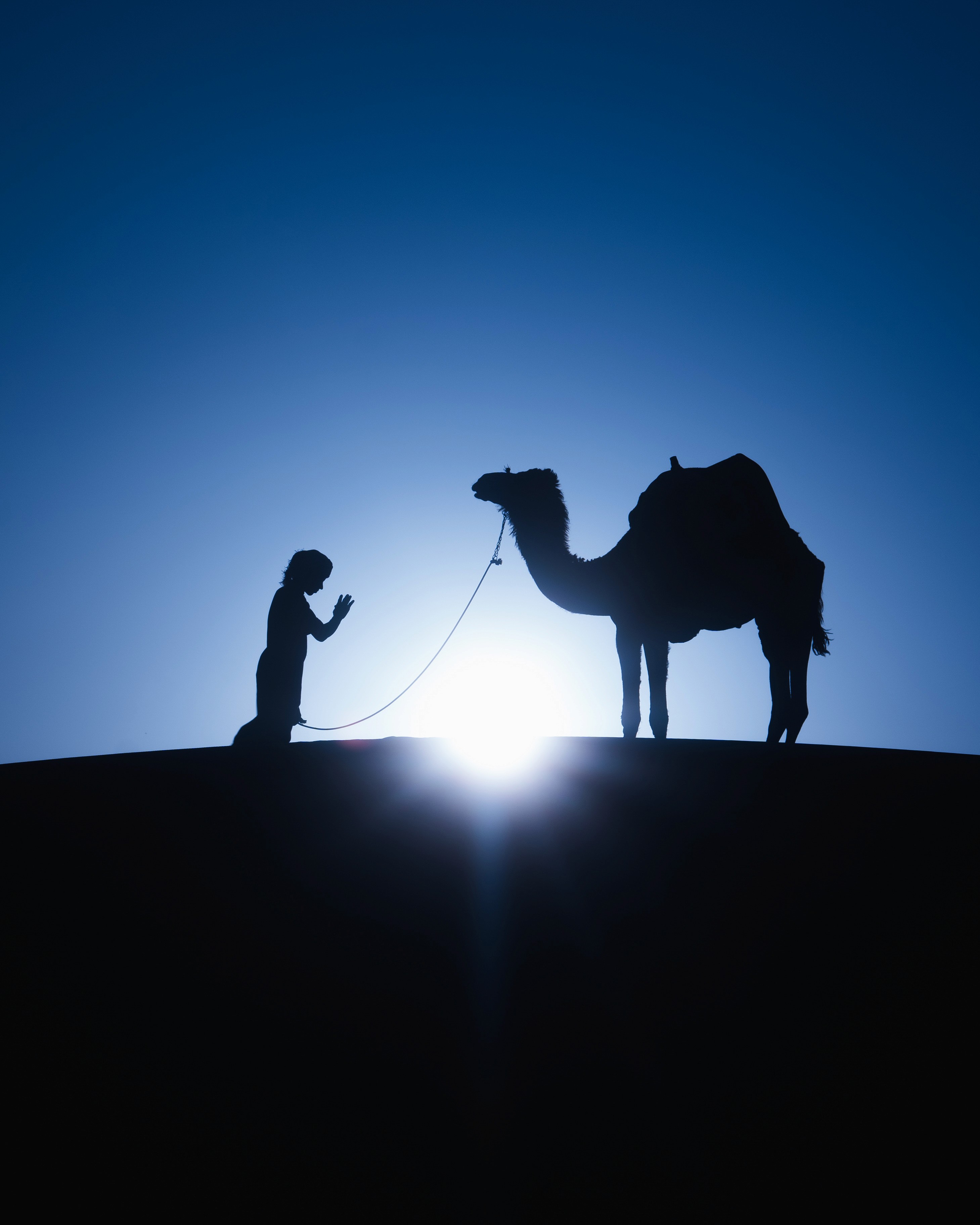 In the late afternoon, we head to dunes and mountain formations where we will photograph camels at sunset and blue hour—a highlight of the trip.